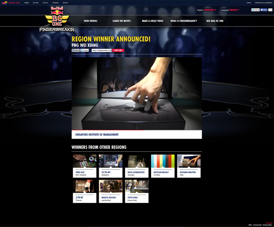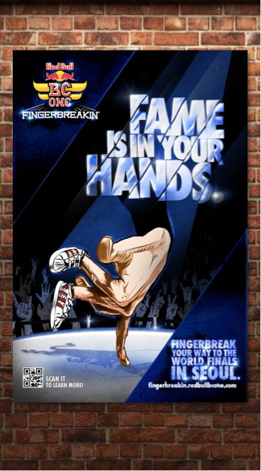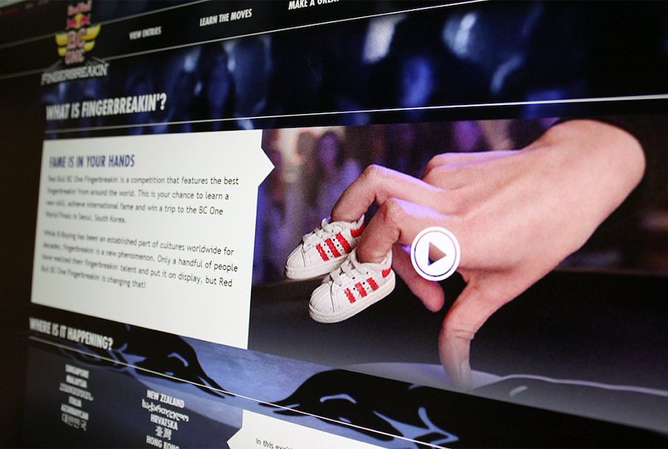 Red Bull BC One—an international B-boying tournament—wanted to engage consumers beyond the familiar B-boy scene. The result was Fingerbreakin’, an international finger breakdancing competition driven by social media. Participants learn how to fingerbreak through the competition site, create a video of their moves and share it online to garner votes in an effort to be crowned World Champion. The project included: identity, website, posters, participant shoe kits and a social hype video, among numerous other pieces.