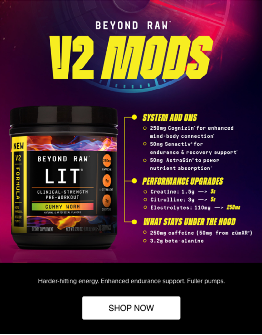 When Beyond Raw souped up its #1 selling pre-workout, it was no longer your run-of-the-mill, “daily driver” formula. This beast got a whole new engine, and we brought a campaign to life that tapped into the human truth of what taking a new pre-workout feels like. By capturing all of the energy and exhilaration this product delivers, it was clear at every step of the consumer journey that LIT V2 packed way more horsepower than its predecessor.